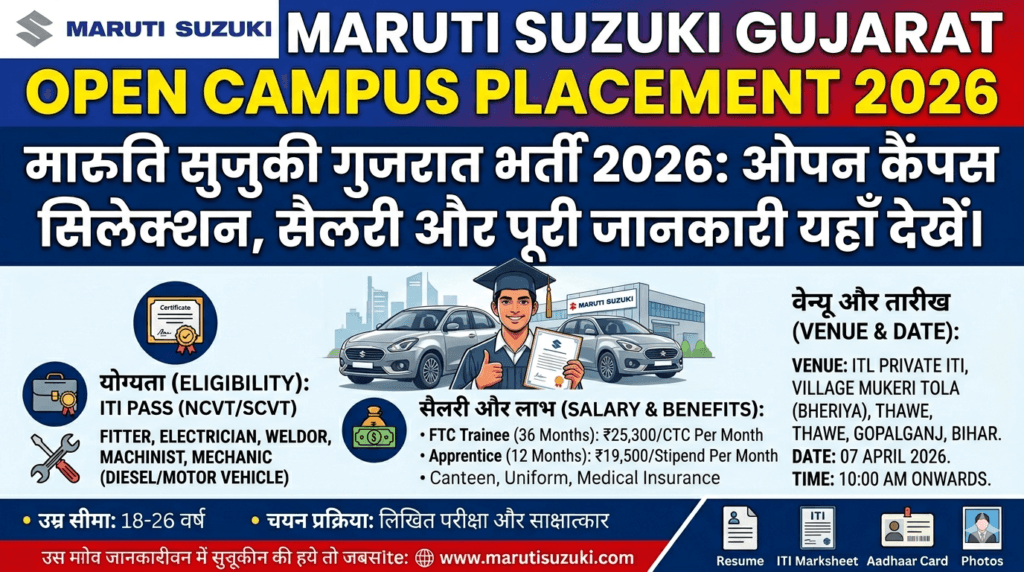 ​Maruti Suzuki Gujarat Open Campus Placement 2026 | Salary, Eligibility & Venue Details ​मारुति सुजुकी गुजरात भर्ती 2026: ओपन कैंपस सिलेक्शन, सैलरी और पूरी जानकारी यहाँ देखें।